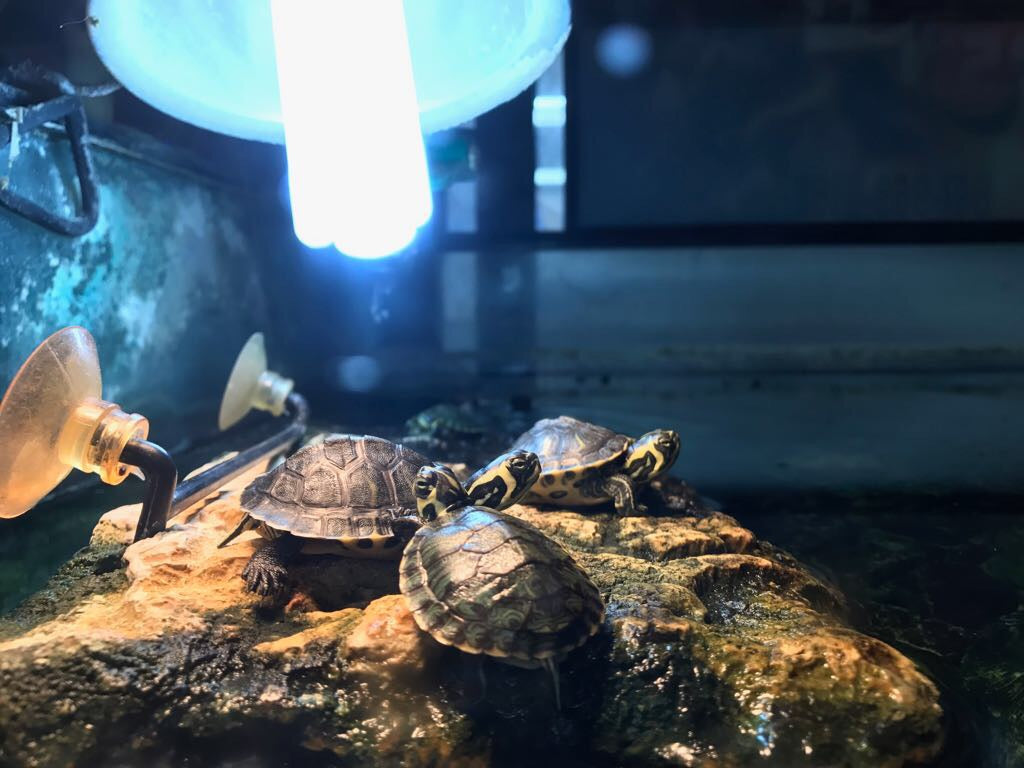 The three-striped mud turtle (Kinosternon baurii) is a small aquatic turtle, typically reaching a carapave length of maximum around 3 to 4 inches.