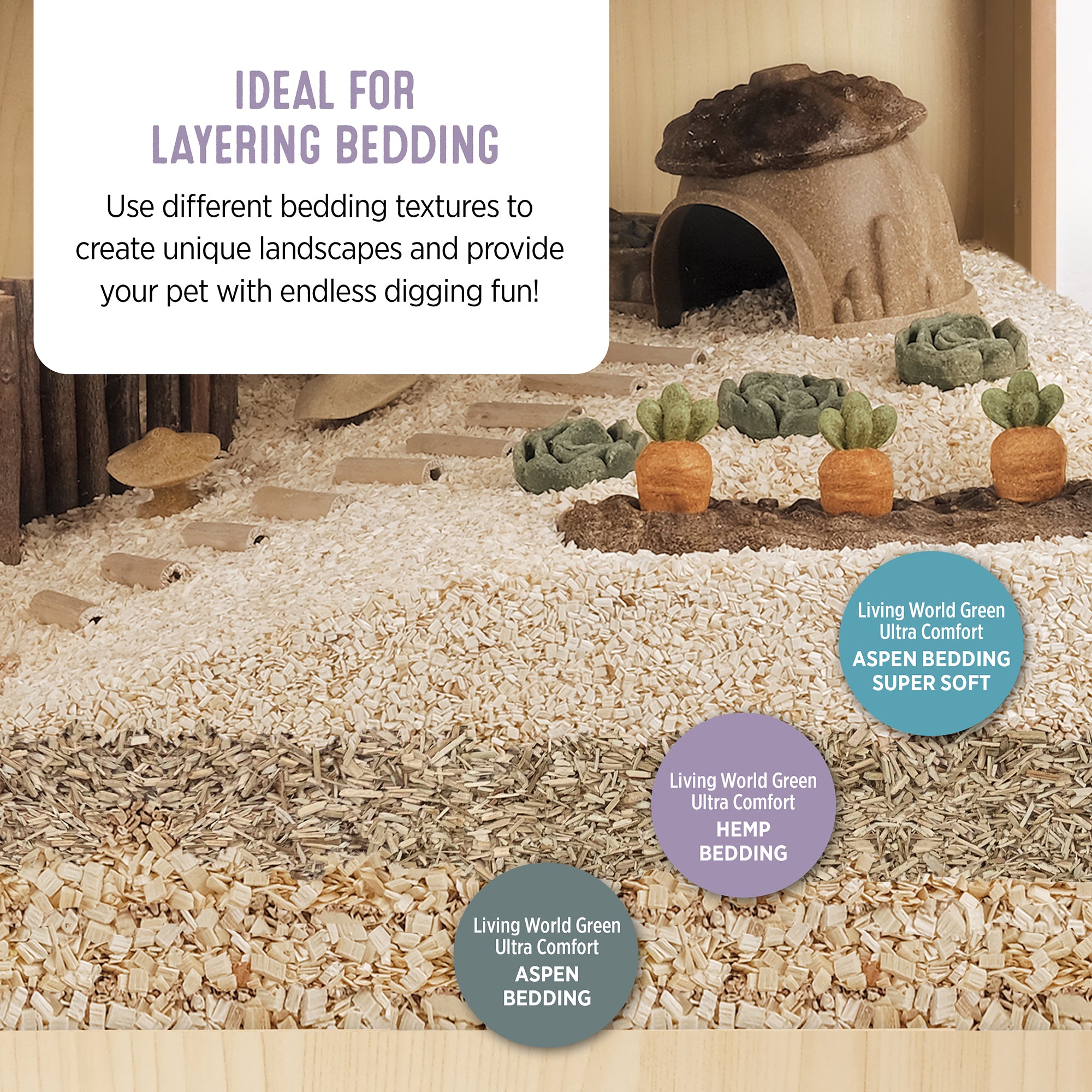 Directions: Add 5 to 7.5 cm (2” to 3”) of Living World Green Ultra Comfort Premium Hemp Bedding to cage or pen. Remove droppings every day if possible. Every few days move the dry bedding aside and remove any over-saturated wet bedding. Add fresh bedding to replace soiled bedding to maintain desired thickness of dry bedding. It is recommended to clean the cage and replace bedding every two weeks. Frequency is dependent on the size of the cage and the number of animals. Living World Green Ultra Comfort Premium Hemp Bedding along with waste is biodegradable and compostable.
